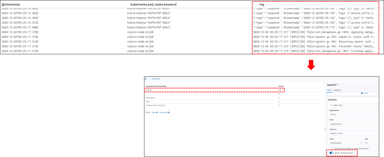 log는 elasticsearch에 저장된 데이터입니다. 키바나 visualize에서 log로 접근을 못하고 aggregation이 끝난 log.keyword로 접근이 가능합니다. missing value옵션을 체크하고 log.keyword데이터를 보면 aggregation이 실패한 갯수가 많은 것을 볼 수 있습니다.