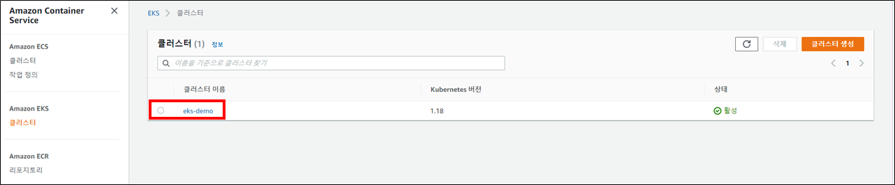 eks가 성공적으로 설치되면 [aws 콘솔 -> eks -> 클러스터]에서 생성된 클러스터가 보입니다.