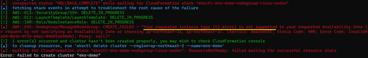 프리티어 ec2타입인 t2.micro를 사용하면 에러가 발생합니다. 현재 서울지역의 워커노드 ec2타입은 프리티어를 미지원합니다.