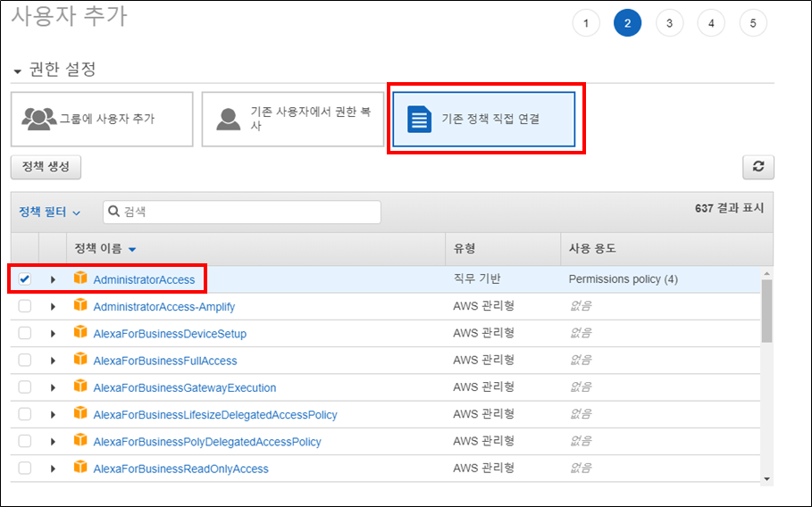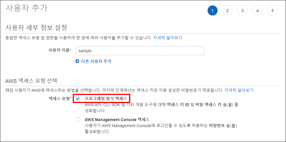 사용자 이름을 입력하고 프로그래밍 방식 액세스를 선택합니다. 프로그래밍 방식은 말 그대로 aws cli를 이용한다는 의미입니다.