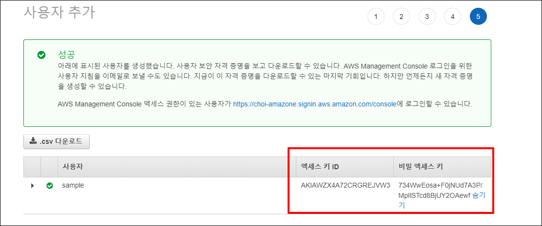 사용자가 생성되면 액세스 키 ID와 비밀 액세스 키가 자동으로 생성됩니다. 이후 부터는 비밀 액세스 액세스 키는 확인이 불가하므로 csv다운로드 버튼을 클릭해서 잘 관리합니다.