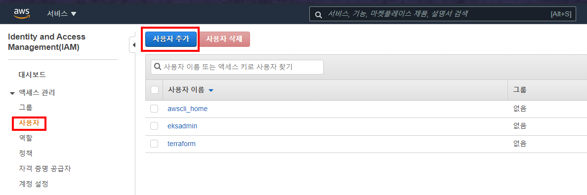 IAM을 사용해서 eks를 관리하는 유저를 생성하고 해당 엑세스 키를 사용합니다.