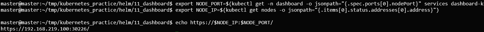 export NODE_PORT=$(kubectl get -n dashboard -o jsonpath="{.spec.ports[0].nodePort}" services dashboard-kubernetes-dashboard)