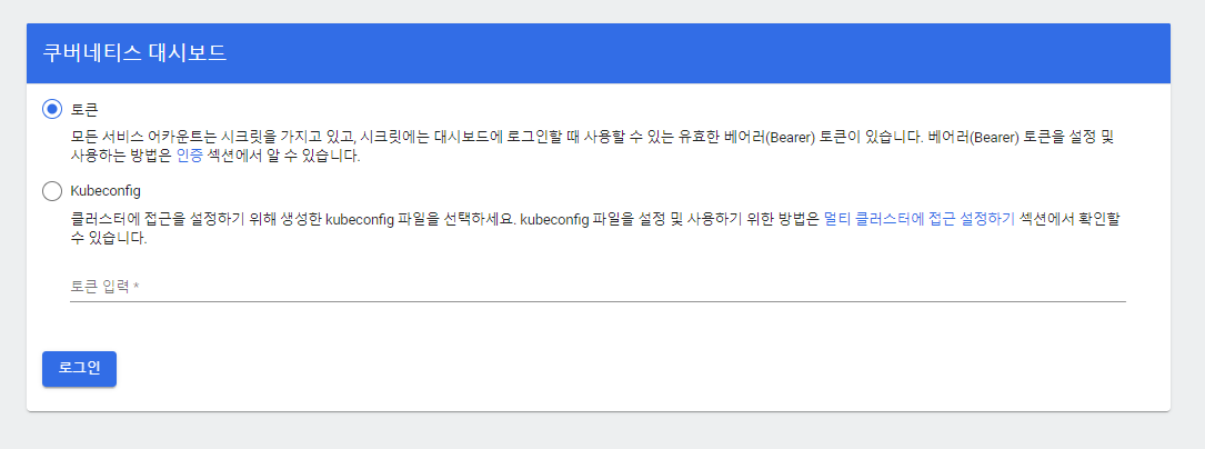 대시보드 접속시 토큰(인증정보)이 필요합니다.