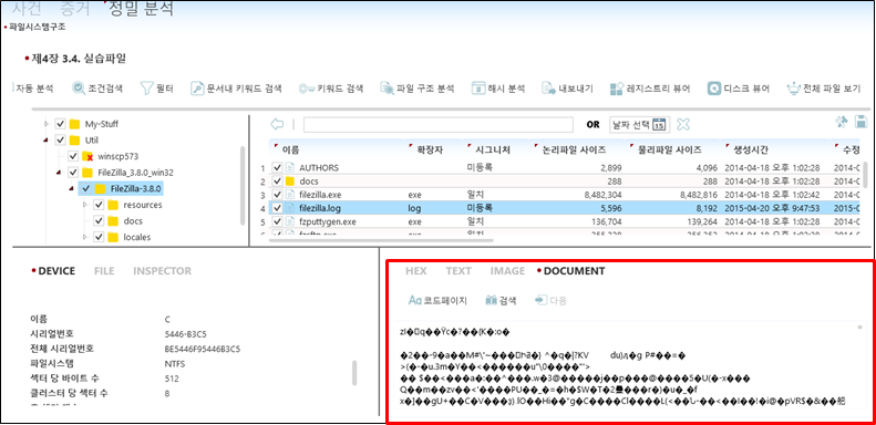 p289페이지에 있는 페이지에 설명되어 있는 'filezilla.log'를 KFOLT로 보면 해당 파일의 내용은 깨져서 나온다.