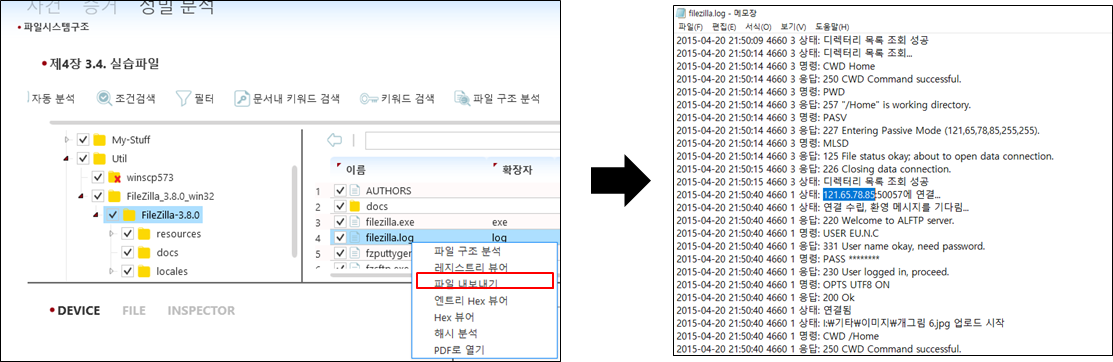 filezilla.log파일을 직접 추출해서 메모장으로 열였더니, 다행히도 내용이 깨지지 않고 출력되었다.
