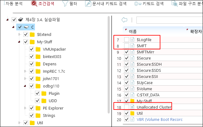 책에서는 범위가 많으므로 일부 파일을 제외하라고 설명하고 있다. $LofFile, $MFT, Unallocated Cluster를 제외했다.