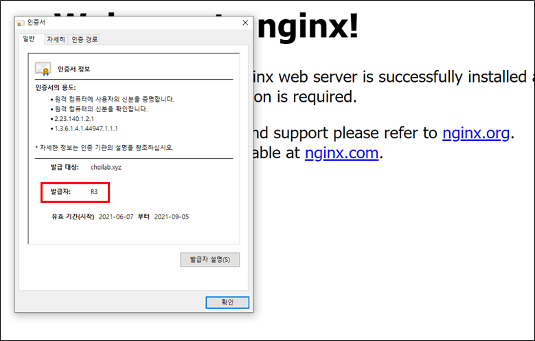 prod Issuer로 인증서를 성공적으로 발급받으면 [그림 12]와 같이 발급자가 R3으로 표시되고 더이상 경고창이 뜨지 않습니다.