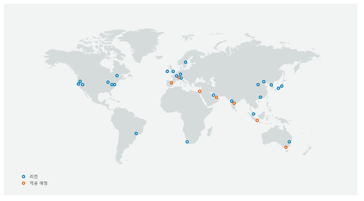 AWS 글로벌 인프라는 Region이라는 용어가 있는데요. AWS 데이터센터가 물리적으로 위치한 지역을 의미합니다. 예로 한국의 서울, 일본의 도쿄, 미국의 샌프라시스코 등이 있습니다. 아직 한국에는 서울밖에 데이터센터가 없습니다.