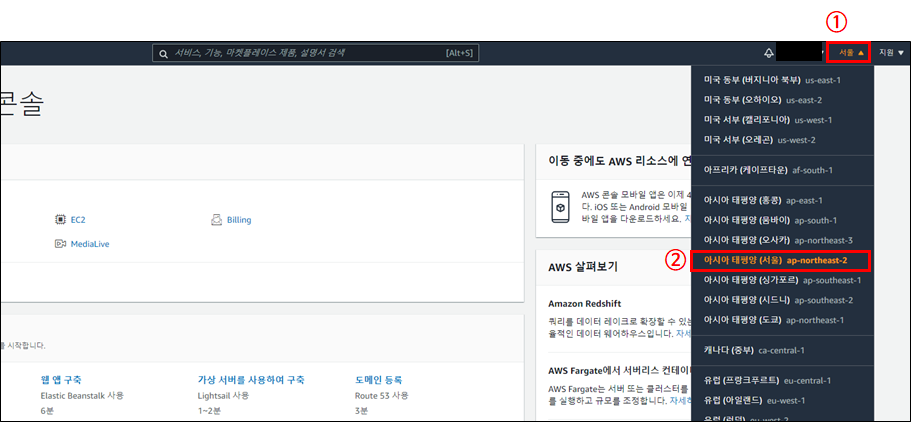 Region은 AWS로그인 시 기본으로 선택되어 있습니다. [그림 4]처럼 화면 오른쪽 위에 현재 선택된 Region을 볼 수 있습니다.