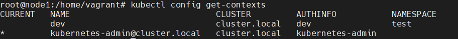 아래 명령어를 사용하면 현재 사용중인 context정보가 출력됩니다. 아래 예제에서는 kubernetes-admin@cluster.local context를 사용합니다.