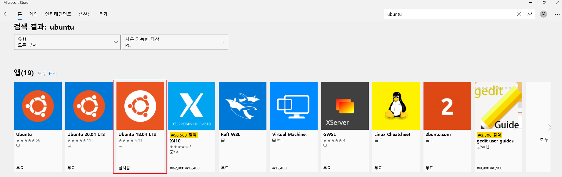WSL는 설치가 끝났는데요. 이제 리눅스 운영체제를 설치하면 됩니다. Microsoft store에서 Ubuntu를 검색해서 18.04 또는 20.04버전을 설치합니다.