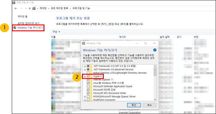 WSL은 가상화 레이어(Hyer-v)를 사용합니다. 그러므로 제어판 > 프로그램 추가/제거에서 Hyper-V를 설치해야 합니다.