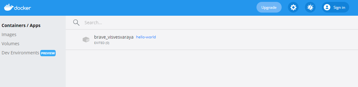 hello-world 컨테이너를 실행해봅시다. hello-world 메세지를 출력하고 컨테이너는 바로 종료됩니다.