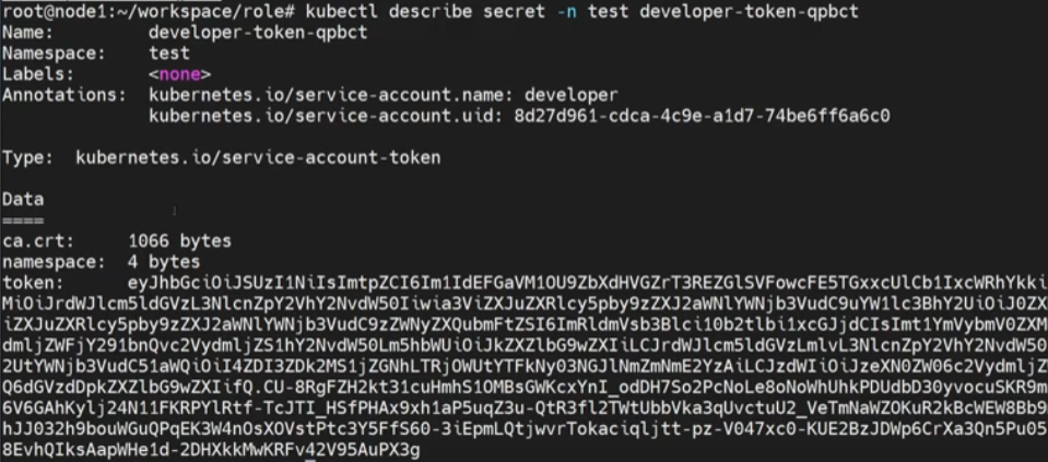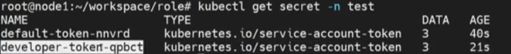 serviceaccount를 생성하면 자동으로 토큰이 만들어집니다. 토큰은 secret에 저장됩니다.