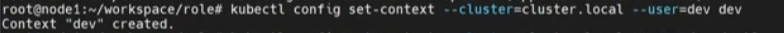 [그림 6]에서 등록한 유저와 [그림 7]에서 확인한 로컬 클러스터를 이용하여 context를 등록할 것입니다. kubectl config set-context로 쉽게 context를 만들 수 있습니다. 아래 명령어는 dev이름으로 context를 생성하는 예제입니다.