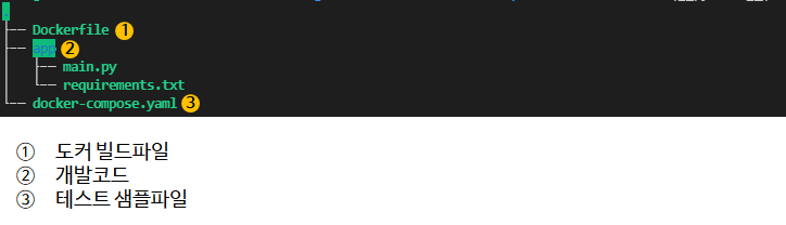 [그림1]처럼 프로젝트 파일/폴더를 관리할 것입니다. Fastapi 작업내용과 도커배포를 위한 Dockerfile, 테스트를 위한 docker-compose.yaml파일로 구성됩니다.