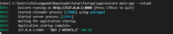 main.py가 있는 곳에서 uvicorn명령어를 실행하면 fastapi가 실행됩니다. --reload옵션은 fastapi 소스코드가 변경되면 자동으로 fastapi를 재실행하는 옵션입니다.