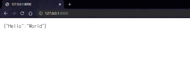 127.0.0.1:8000주소로 api를 요청하면 json타입인 hello world를 볼 수 있습니다.