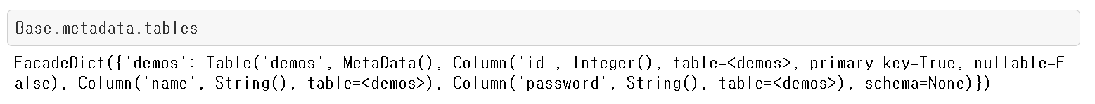 from sqlalchemy import Column, Integer, String class Demo(Base): __tablename__ = 'demos' id = Column(Integer, primary_key=True) name = Column(String) password = Column(String)
