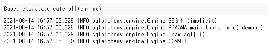 create_all함수 실행결과를 보면 맨 마지막 로그에 COMMIT이 보입니다. ORM 쿼리 실행을 반영하기 위해서는 항상 마지막에 COMMIT이 실행됩니다.