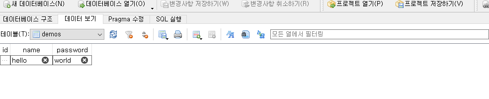 sqlite viewer로 확인하면 테이블에 hello world행이 추가된 것을 확인할 수 있습니다.