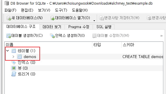 sqlite viewer에서 테이블 목록을 확인하면 demos테이블이 잘 보입니다.