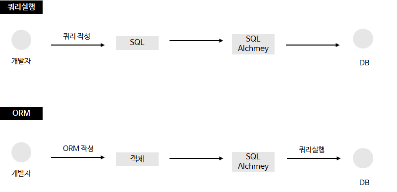 기존에 쿼리문을 직접 작성 sql alchemy에게 쿼리실행을 맡겼었습니다. ORM은 쿼리 대신 객체와 관련된 작업을 넘겨주면 sql alchemy가 객체를 쿼리문으로 변경해서 실행하게 됩니다.