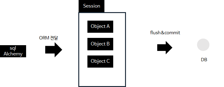 sqlalchemy는 개발자가 요청한 ORM을 데이터베이스에 바로 반영하지 않습니다. proxy object라고 불리는 중간 메모리 공간에 ORM을 먼저 저장합니다. 그리고 cocmmit메소드가 호출되면 그때서야 proxy object에 저장된 ORM을 데이터베이스에 반영합니다. proxy object를 sqlalchemy에서는 Session이라고 부릅니다.