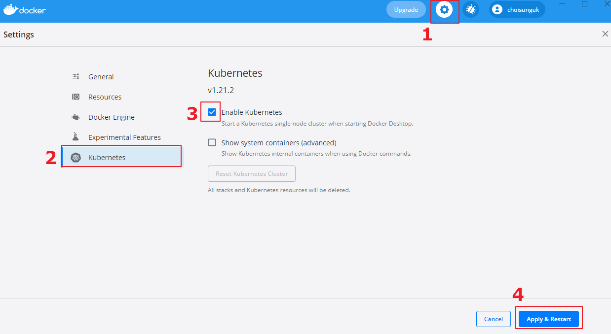 docker desktop 설정에서 미니큐브 체크박스를 선택하면 설치가 끝납니다.