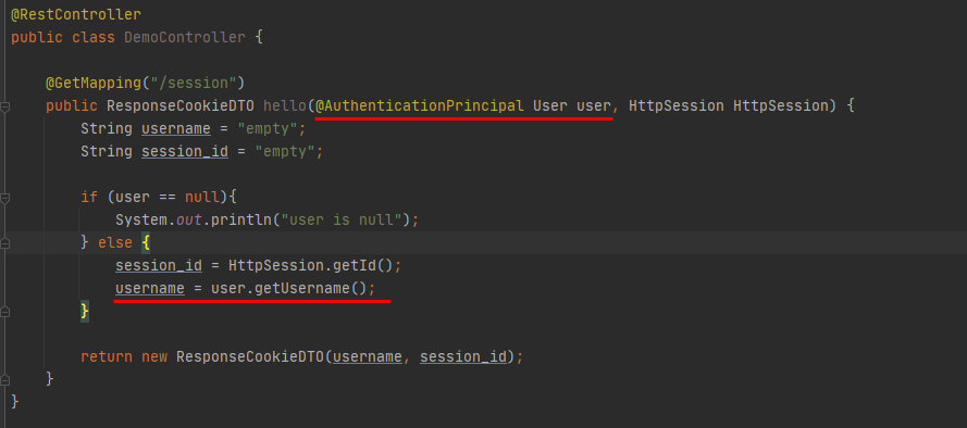public ResponseCookieDTO hello(@AuthenticationPrincipal User user, HttpSession HttpSession) {