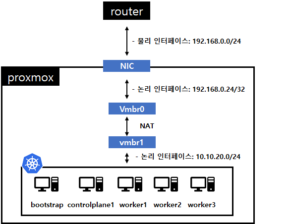 controlplane1대와 worker3대로 구성했습니다. kubespray를 이용해서 쿠버네티스를 설치했고 외부에서 접근을 못하도록 사설네트워크와 NAT를 설정했습니다.