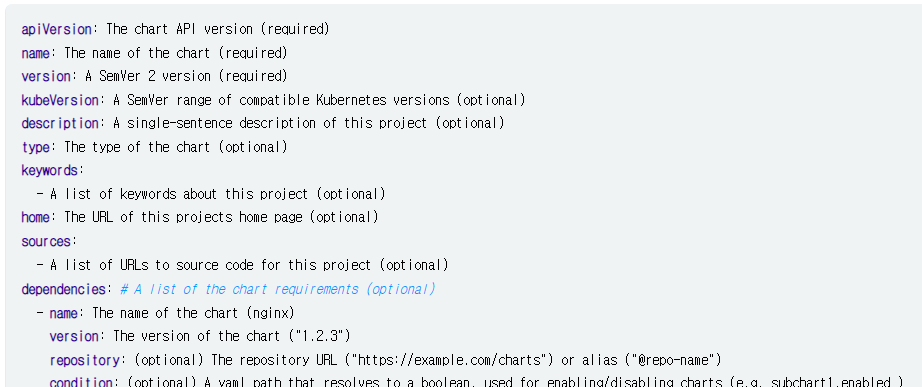 Chart.yaml파일은 helm 차트가 설치될 때 (메타)정보를 설정합니다. 설정할 수 있는 차트정보가 매우 많습니다.