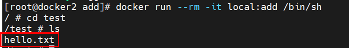 컨테이너를 직접 실행하고 파일을 확인하면 hello.tar파일이 보입니다. 의도한대로 파일이 잘 복사되었습니다.