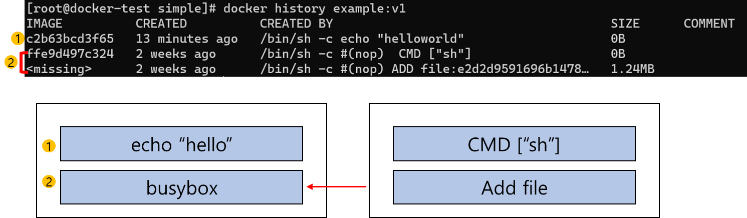 docker history명령어를 사용하면 이미지 레이어 전체를 볼 수 있습니다. 레이어 2개라고 예상했지만 실제로는 3개의 레이어가 보입니다. busybox이미지가 2개의 레이어로 구성되어서 총 3개의 레이어가 있습니다.