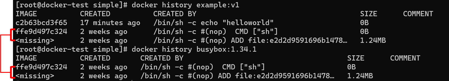 busybox도 docker history로 확인하면 레이어 갯수가 보입니다. 예상대로 2개의 레이어가 있네요.