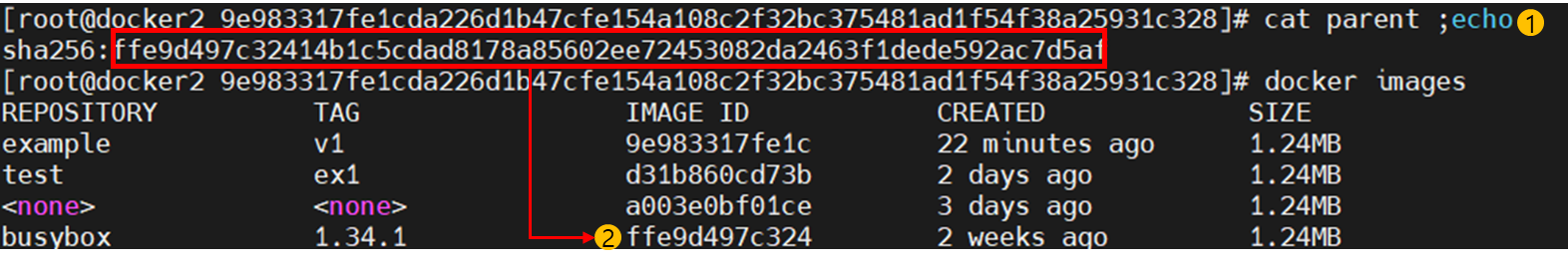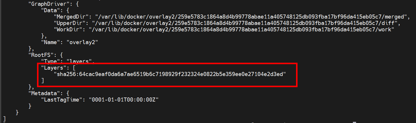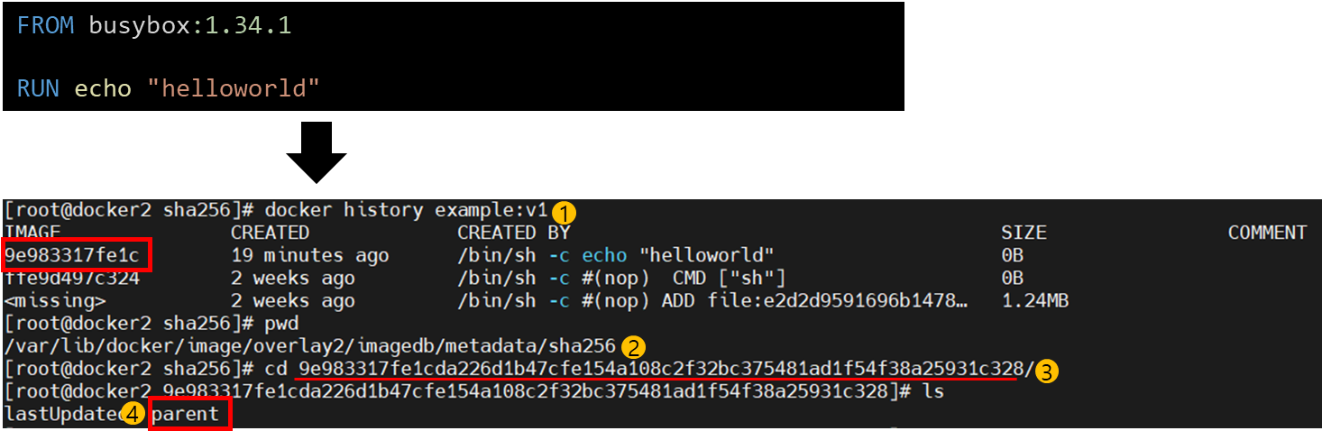 parent 정보는 파일로 저장됩니다. /var/lib/docker/image/{storage-driver}/imagedb/metadata/sha256/{도커 이미지id}/parent파일이 연결된 이전 레이어의 도커 이미지id를 저장합니다.