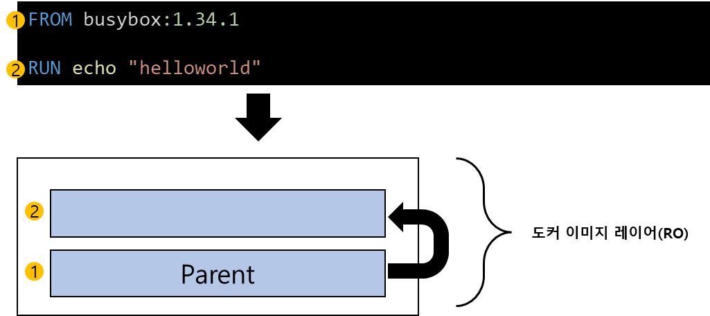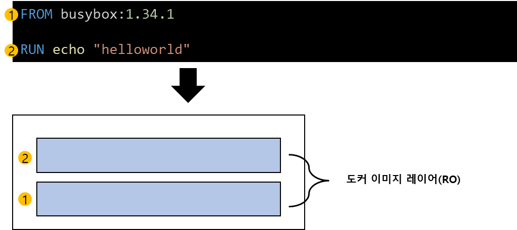 도커 이미지 레이어는 Dockerfile 명령어 갯수와 동일합니다. 아래 Dockerfile에서는 FROM과 RUN, 총 2개의 명령어가 있습니다. docker build를 실행하면 총 2개의 이미지 레이어가 생성됩니다.