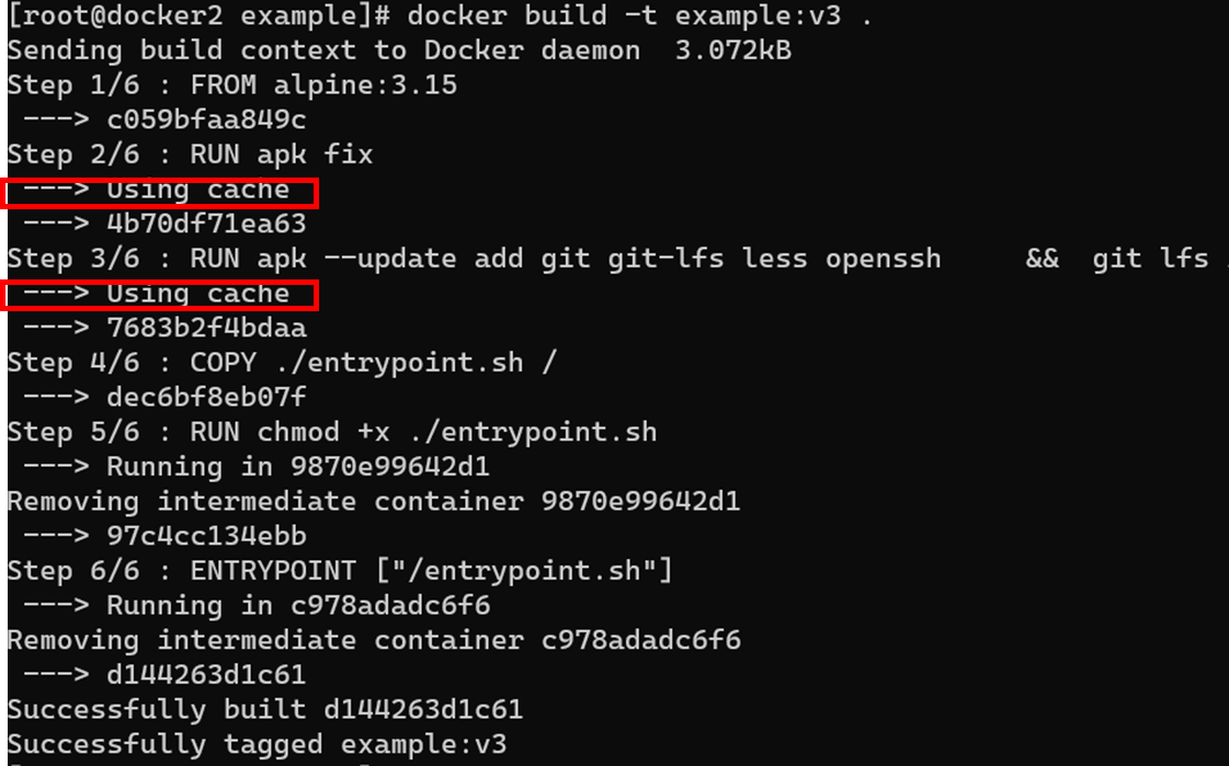 다시 docker build를 수행해봅시다. 이전과 다르게 git을 설치하는 이미지 레이어는 캐시를 사용했습니다. 그리고 copy명령어와 RUN, ENTRYPOINT명령어만 새로 이미지 레이어를 생성했습니다. 또한, 빌드속도가 엄청 빨라진 것을 느낄 수 있습니다.