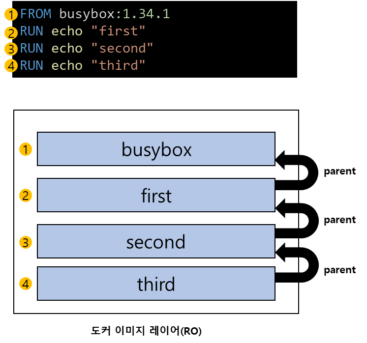 예제를 살펴보겠습니다. 아래 Dockerfile은 간단히 echo 리눅스 명령어를 사용해서 문자열을 stdout으로 출력합니다. 각 이미지 레이어는 parent이미지 레이어를 가지고 있습니다. busybox(parent)<-second, first(parent)<-second, second(parent)<-third 순서로 이미지 레이어는 연결되어 있습니다.