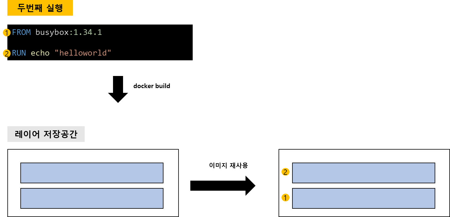 첫 번째 docker build이후에, 동일하게 docker build를 수행했다고 가정해봅시다. 레이어 저장공간에 이전에 생성한 동일 이미지 레이어가 있어서 빌드를 수행하지 않고 이미지 레이어를 재사용합니다. 빌드를 수행하지 않았으므로 빌드속도가 빨라집니다.