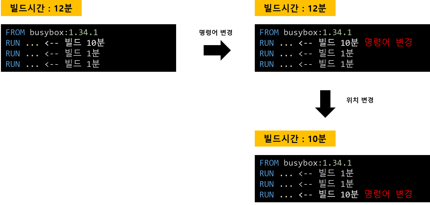 이미지 레이어 수정이 빈번한 dockerfile명령어는 최대한 마지막에 쓰는 것이 중요합니다. 만약, 제일 위에 빈번한 수정이 있는 이미지 레이어가 있다면, 수정할 때마다 대부분의 이미지 레이어를 생성합니다. 그만큼 빌드속도가 느리고 이미지 레이어 저장공간을 차지합니다.