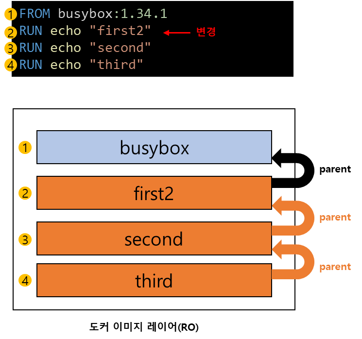2번째 Dockerfile명령어를 수정하면 2번째 이미지 레이어가 새로 생성됩니다. 그리고 3번째 레이어는 parent이미지 레이어가 수정되서 데이터가 같을지라도 이미지 레이어가 새로 생성됩니다. 4번째 레이어도 3번째 레이어가 수정되서 이미지 레이어가 생성됩니다. 결과적으로, 수정한 2번째 레이어부터 캐시를 사용하지 않고 이미지 레이어가 생성됩니다.