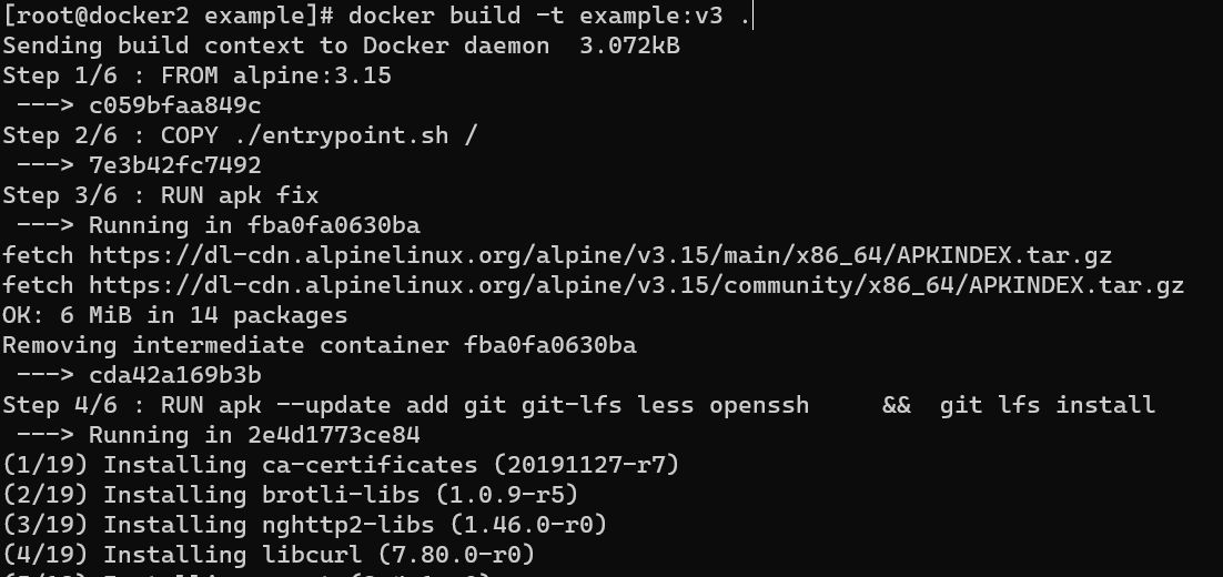 그리고 다시 docker build를 해봅시다. 결과가 어떻게 나오죠? entrypoint.sh파일을 수정만 했는데 다시 git을 설치하는 것을 볼 수 있습니다.