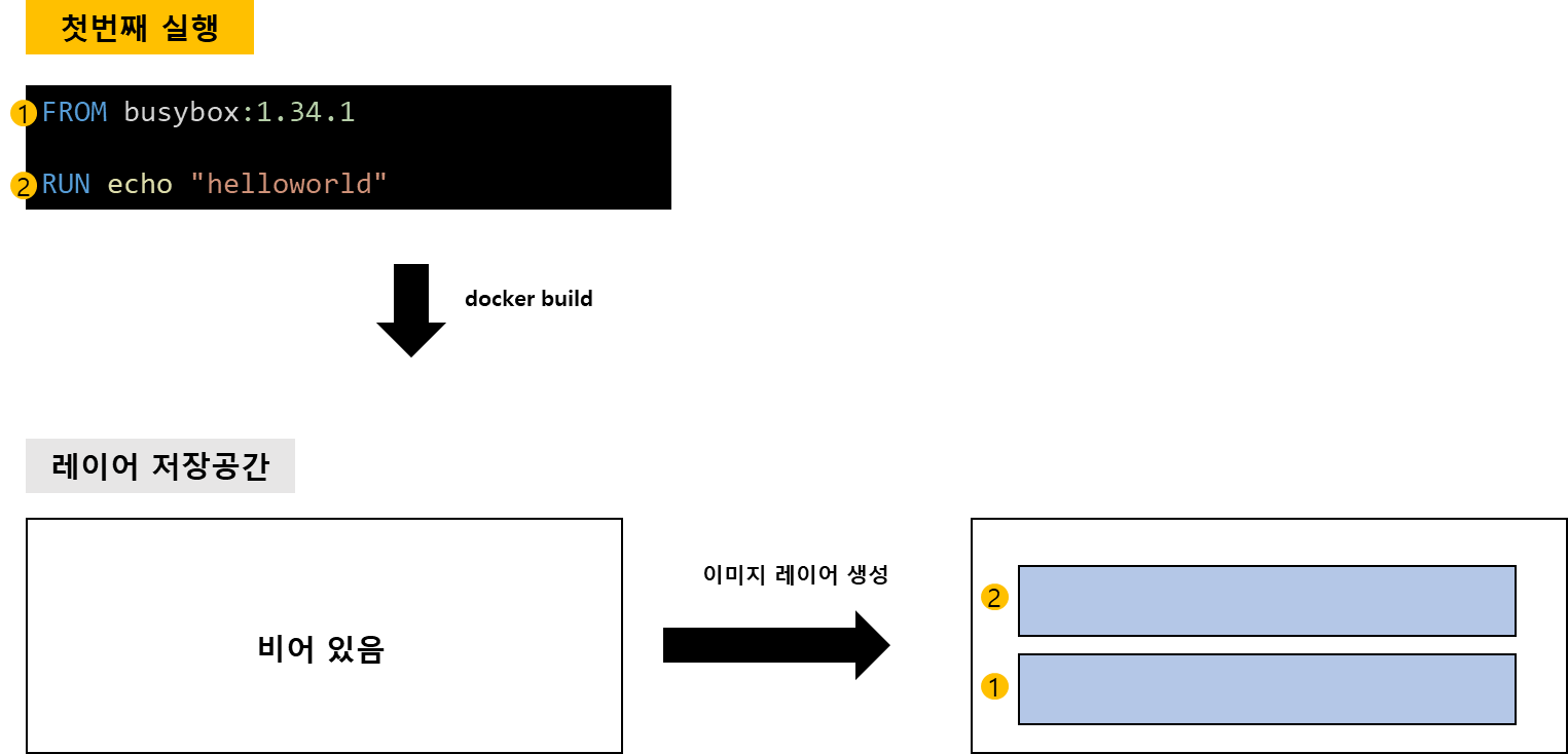 처음 docker build명령어를 실행했다면 레이어 저장공간에 이미지 레이어가 없으므로 빌드를 수행합니다. 빌드를 수행하면 이미지 레이어가 생성되고 레이어 저장공간에 저장됩니다. 정확한 표현은 각 레이어가 docker commit을 수행하여 도커 이미지가 생성됩니다.