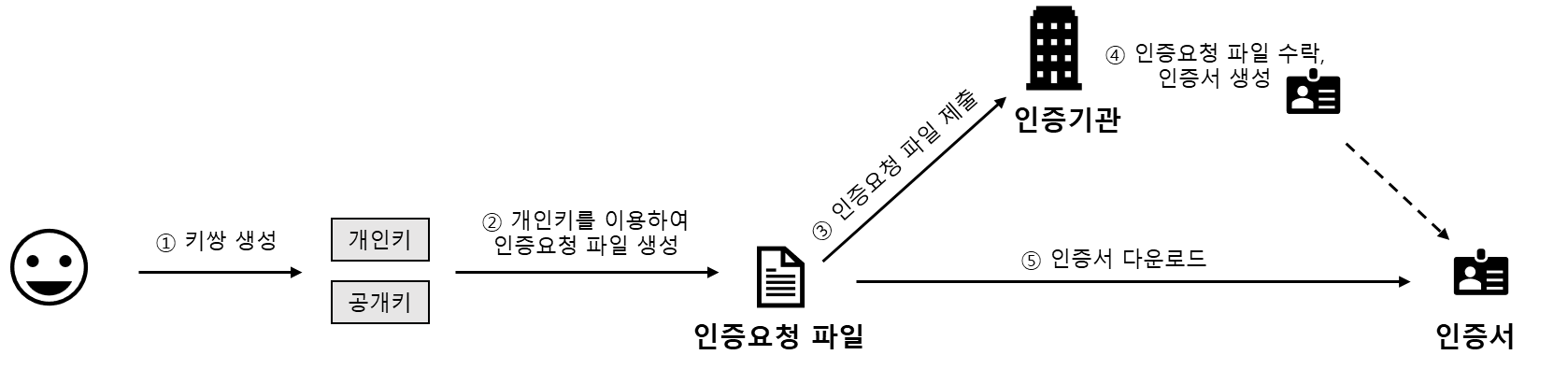인증서를 만들고자 하는 주체는 개인키를 이용해서 인증요청 파일(CertificateSigningRequest)을 만듭니다. 그리고 인증기관에게 인증수락을 요청합니다. 인증기관은 인증요청을 수락하면 인증서가 생성됩니다.