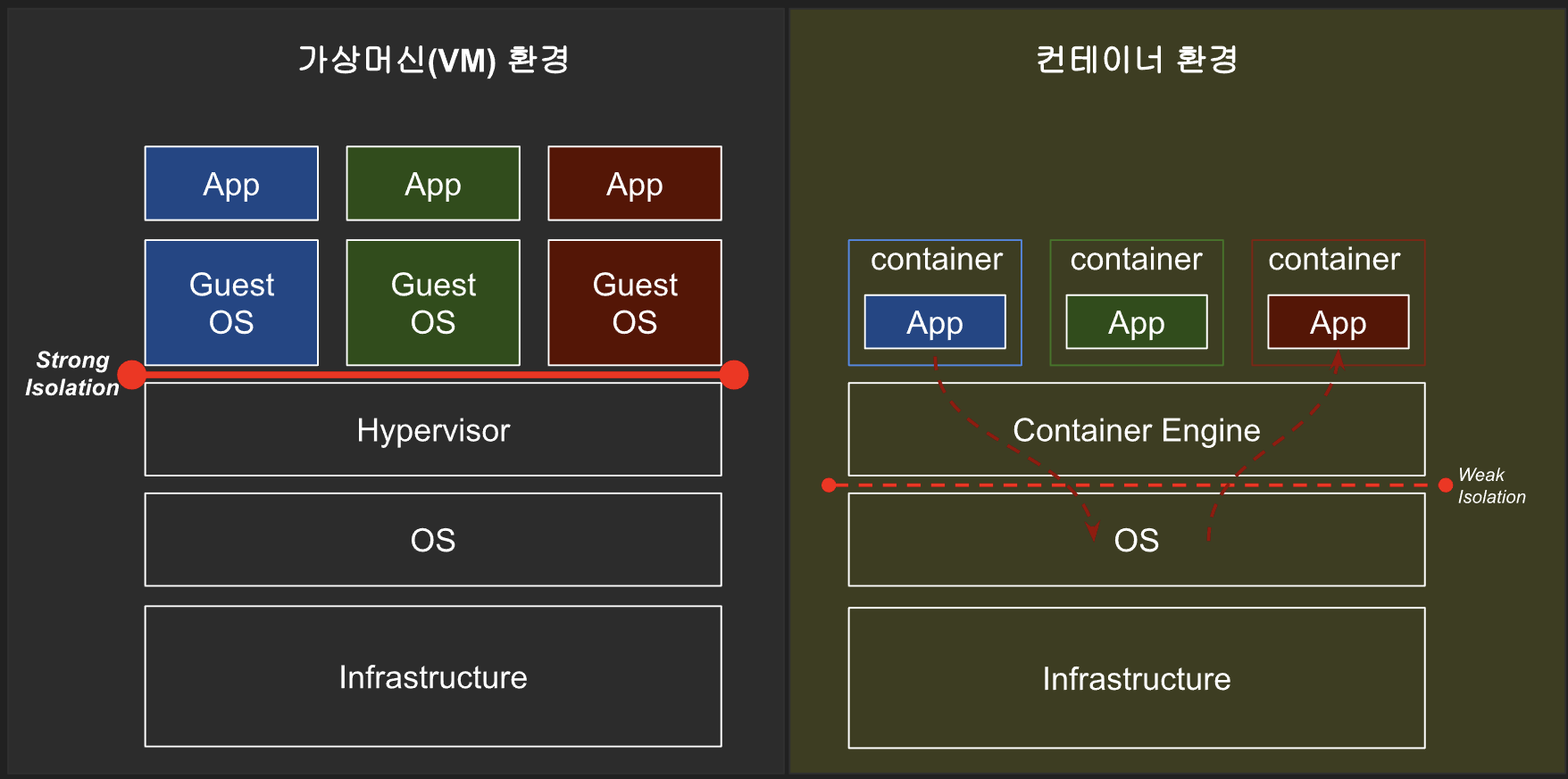 컨테이너는 약한격리, 하이퍼바이저는 강한격리라고 표현합니다. 컨테이너의 격리수준은 하이퍼바이저보다 약합니다.