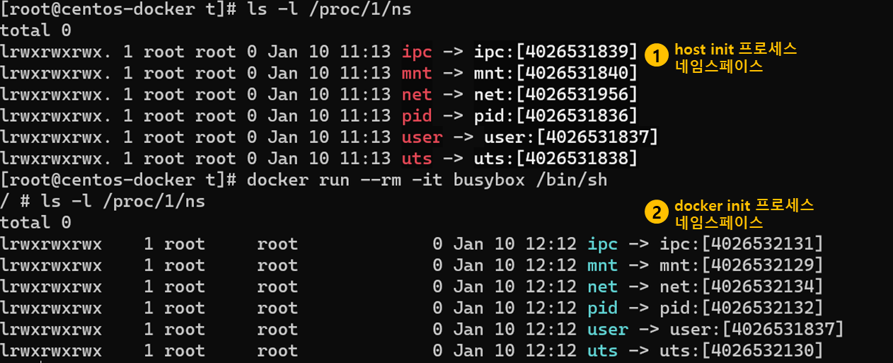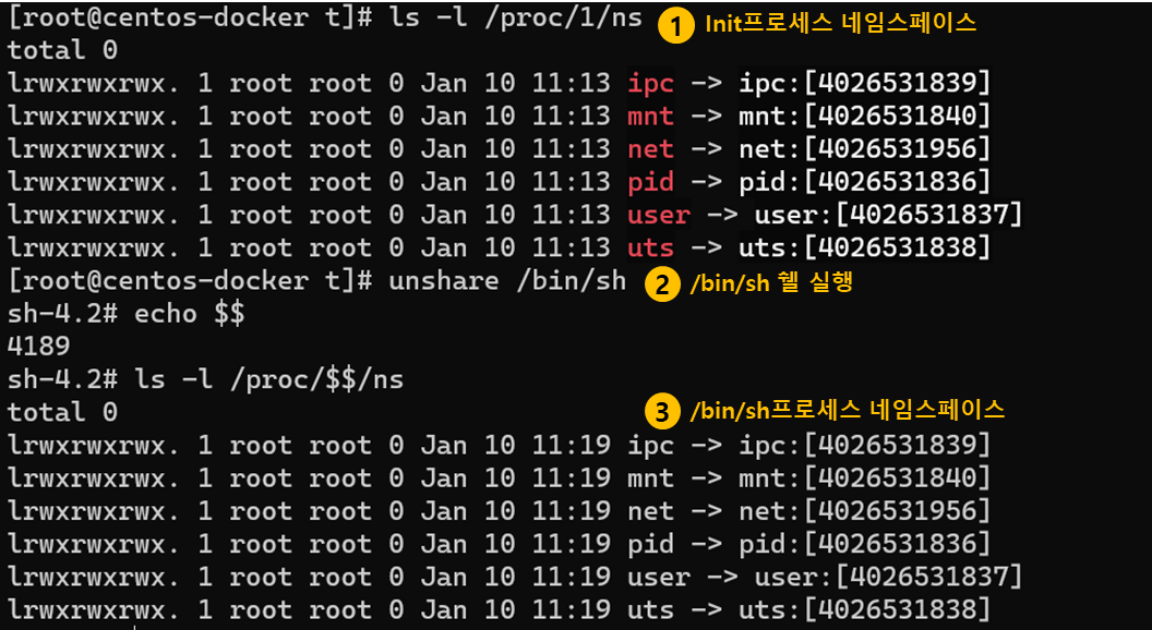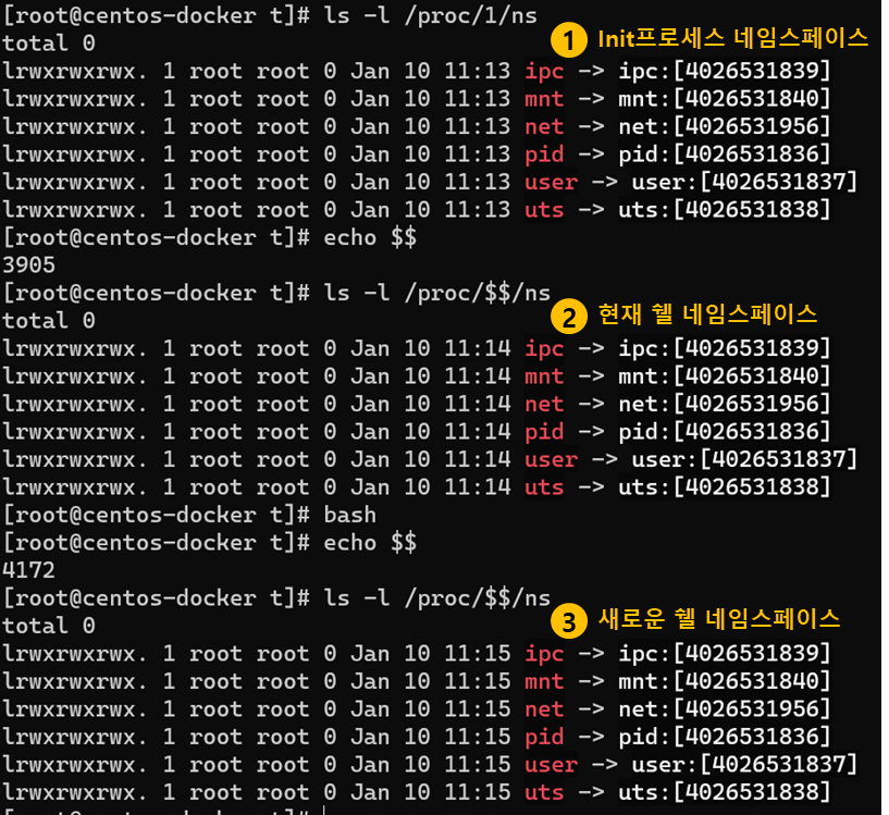 네임스페이스는 각각 ID를 가지고 있습니다. 기본설정으로 리눅스 프로세스는 최초 프로세스인 init프로세스 네임스페이스를 사용합니다. 새로운 프로세스를 실행하고 이전 프로세스 네임스페이스와 비교하면 네임스페이스ID가 같습니다.