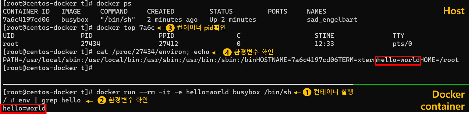 도커 컨테이너의 환경변수는 /proc/<도커 컨테이너 PID>/environ파일에서 확인할 수 있습니다.