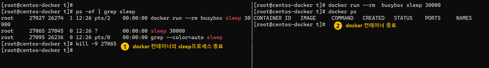 host에서 kill명령어로 sleep프로세스를 죽입니다. 죽이는 동시에 docker 컨테이너가 종료된 것을 알 수 있습니다. 도커 컨테이너가 종료된 이유는 init프로세스가 sleep프로세스이기 때문입니다. init프로세스가 종료되어 도커 컨테이너는 자동으로 종료되었습니다.